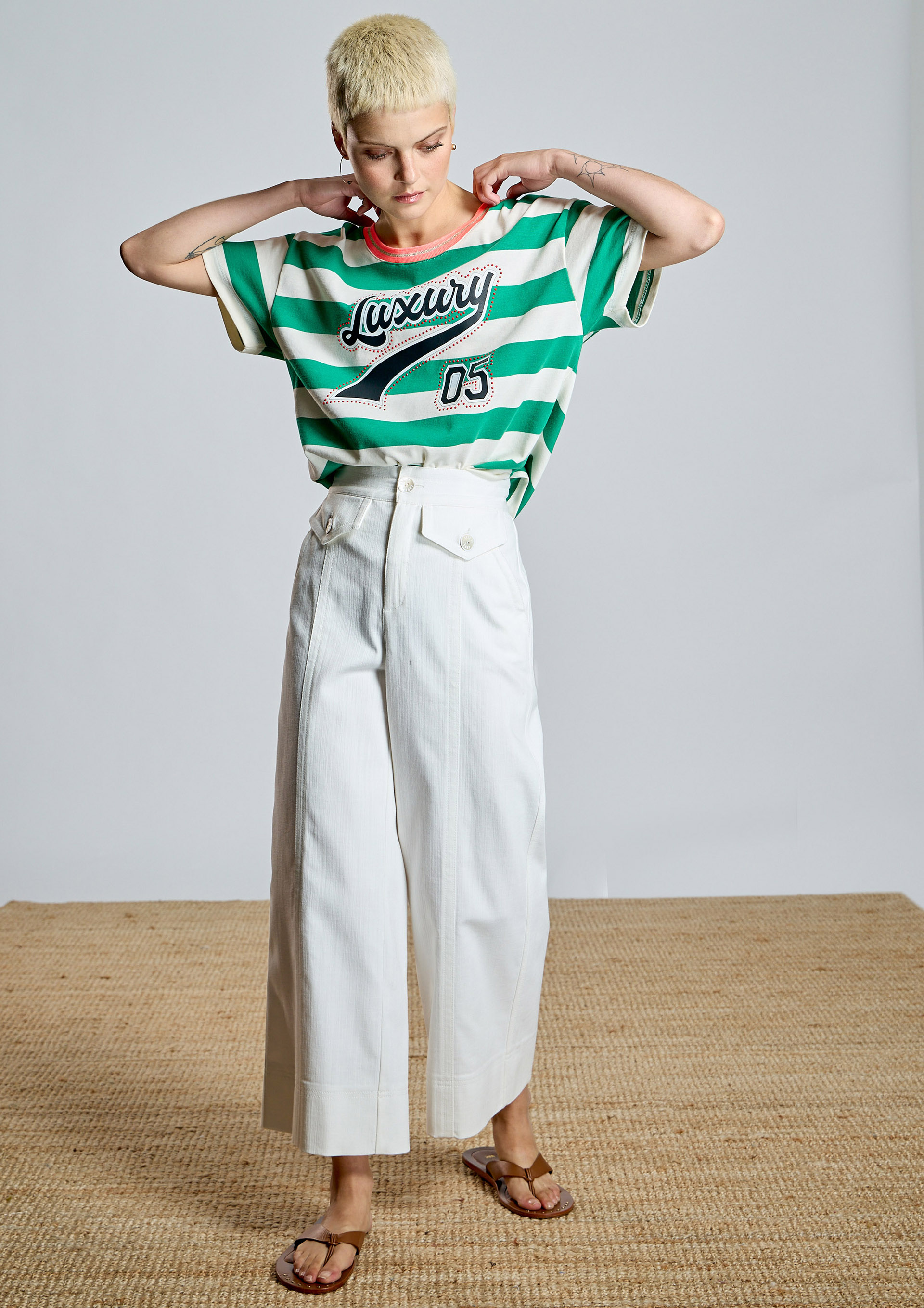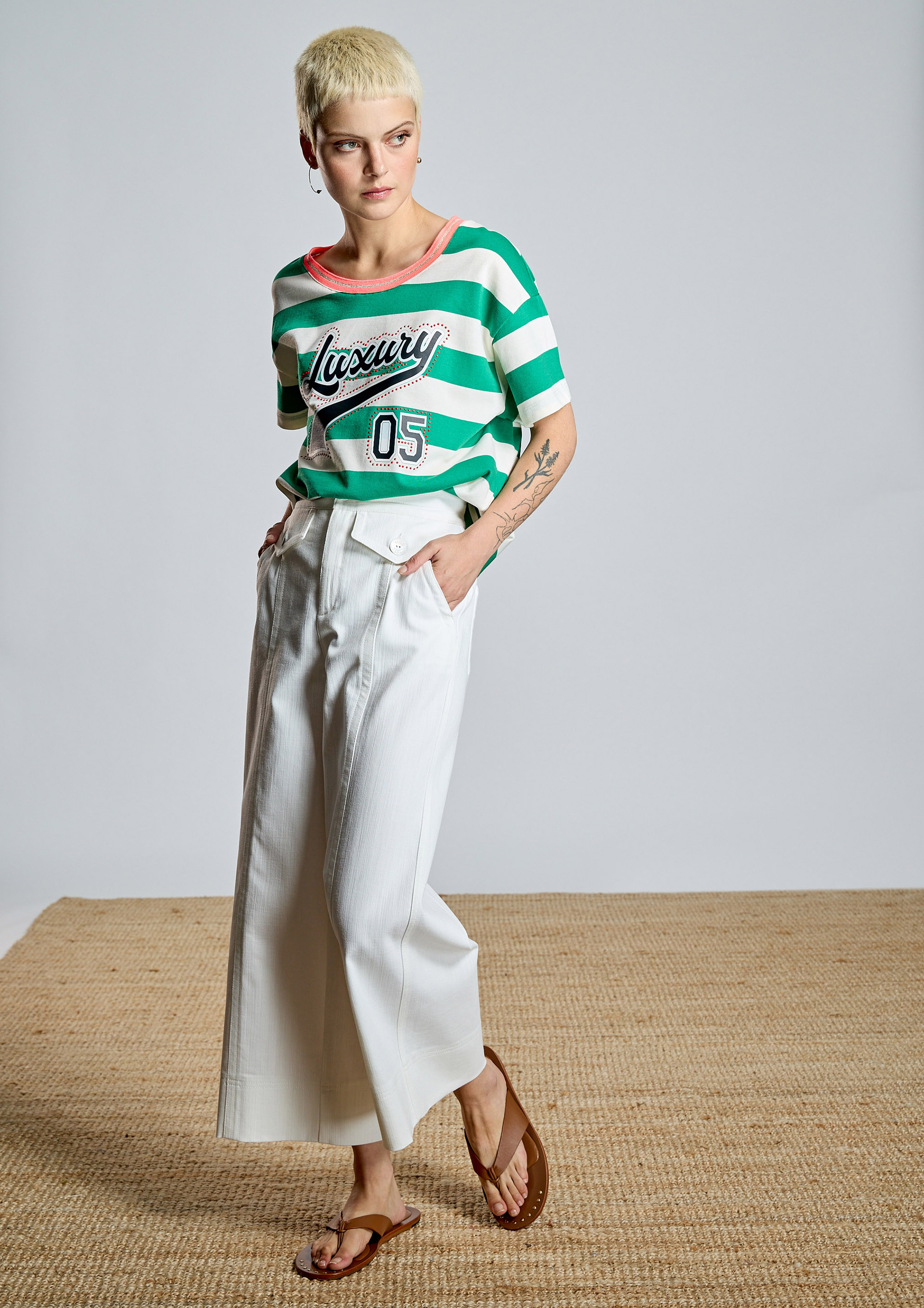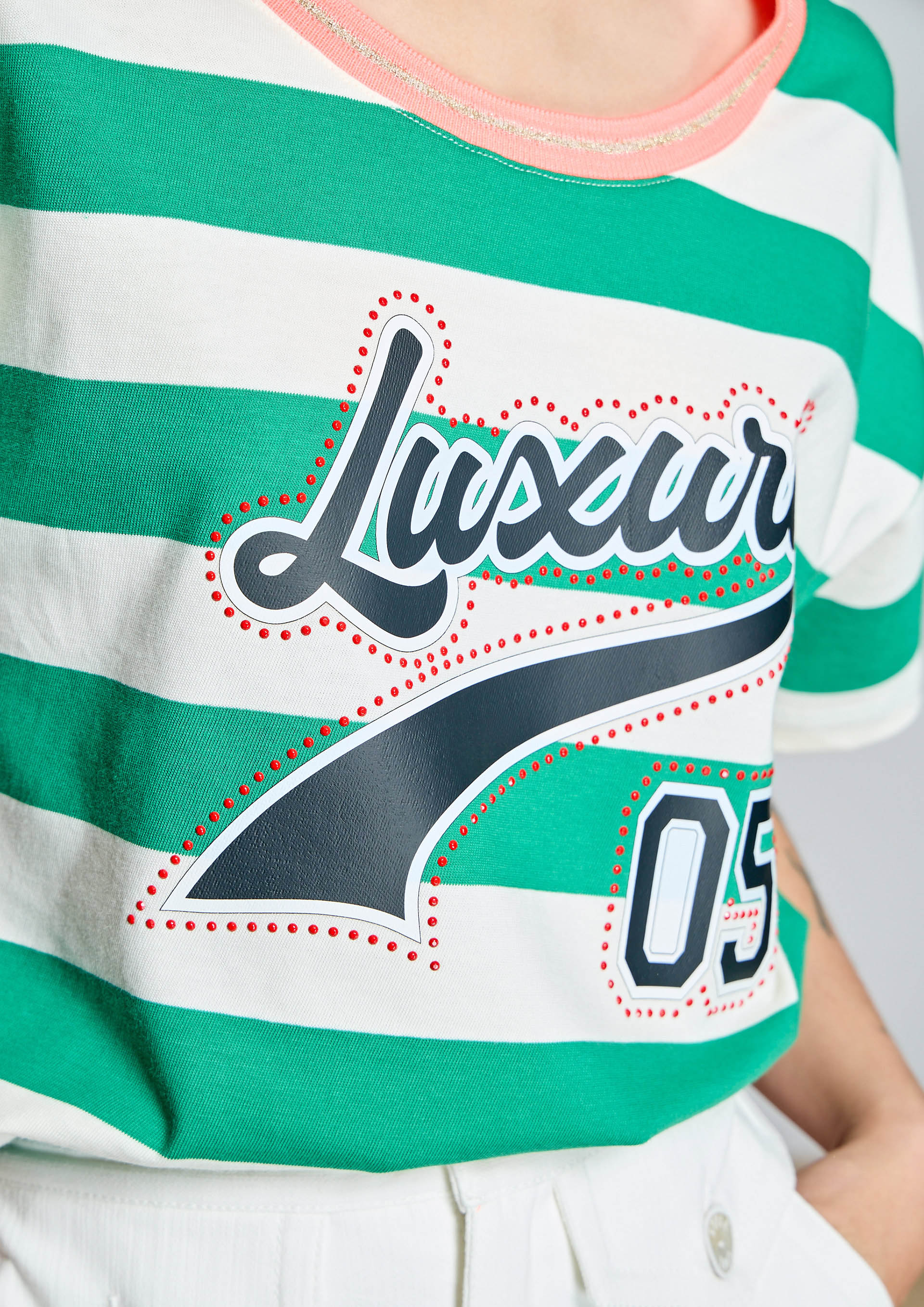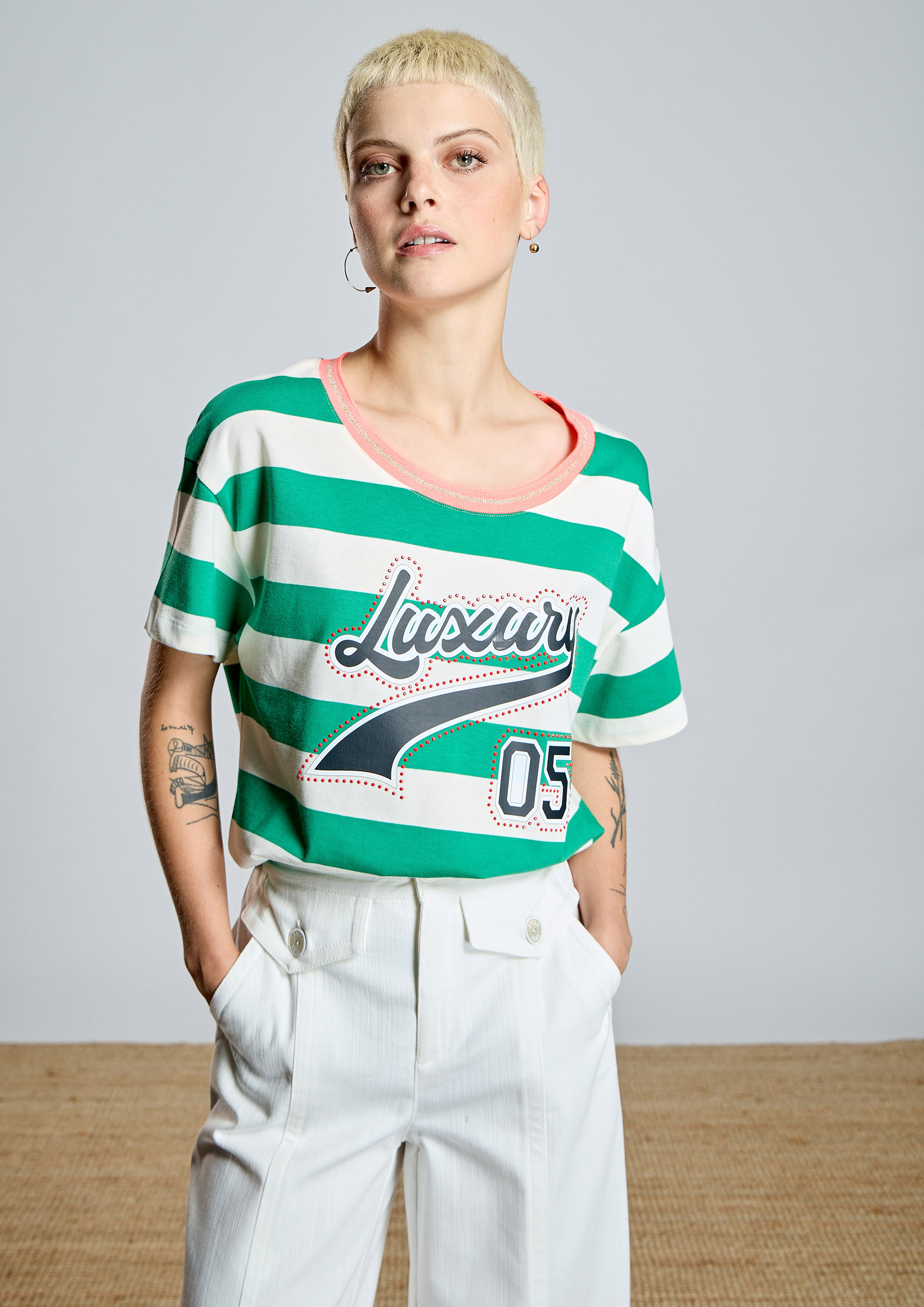 Camiseta de rayas AC con diseño fresco y desenfadado. Presenta cuello redondo con ribete a contraste, transfer delantero y manga corta de corte relajado, ideal para un estilo cómodo y actual. Perfecta para looks casuales con un aire veraniego y natural.