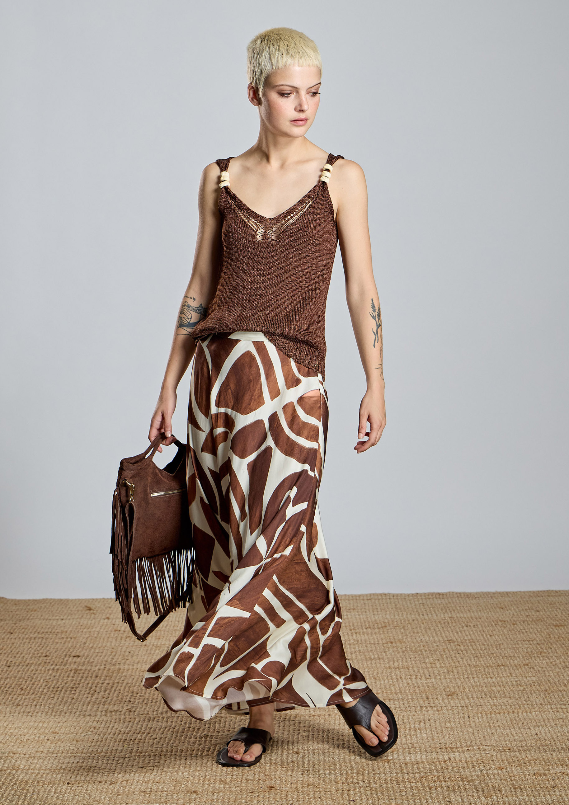 Falda larga AC con estampado gráfico y silueta evasé. Diseño de tiro medio, con cintura lisa y caída fluida que aporta movimiento. Cierre lateral con cremallera invisible y botón interior.