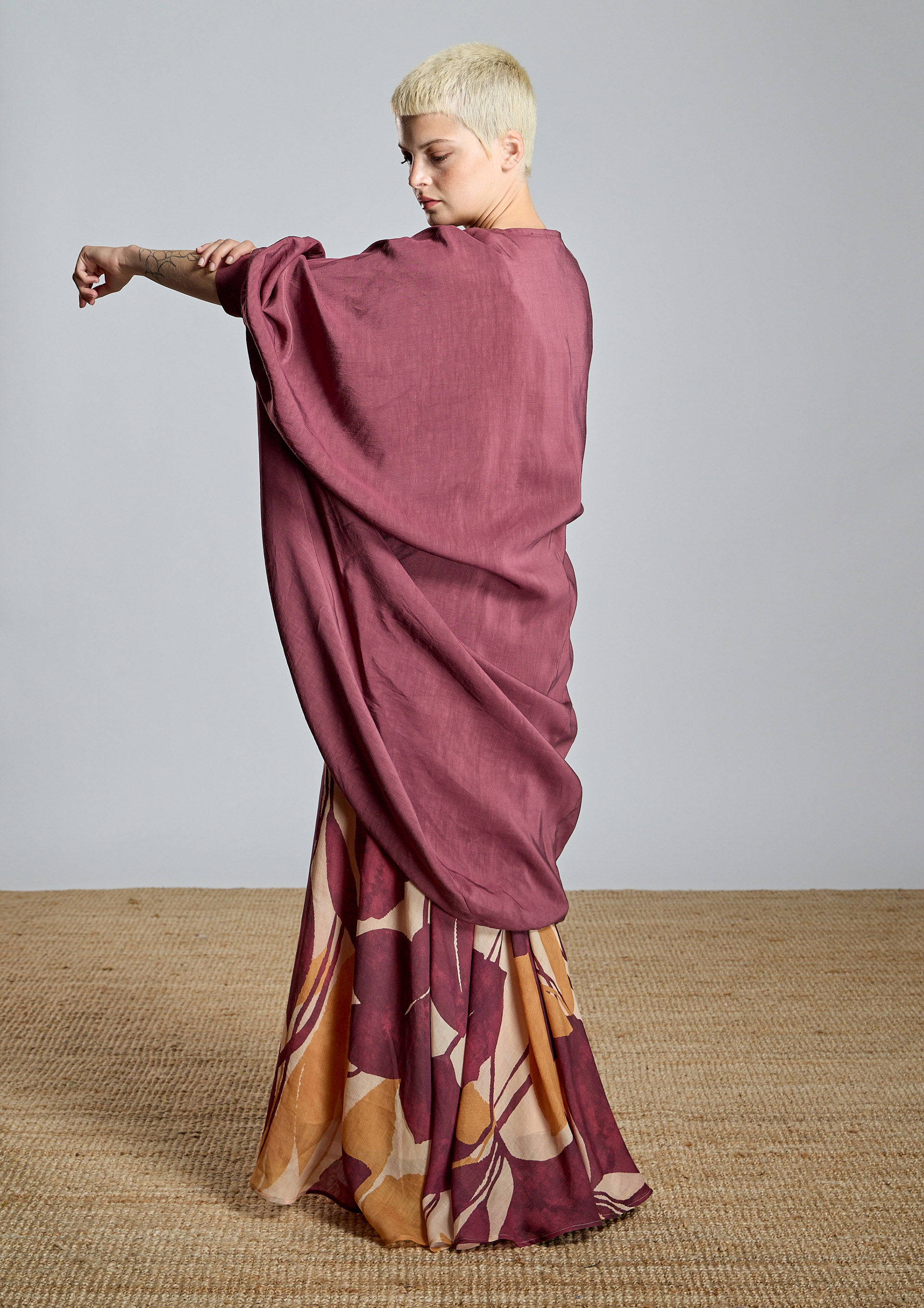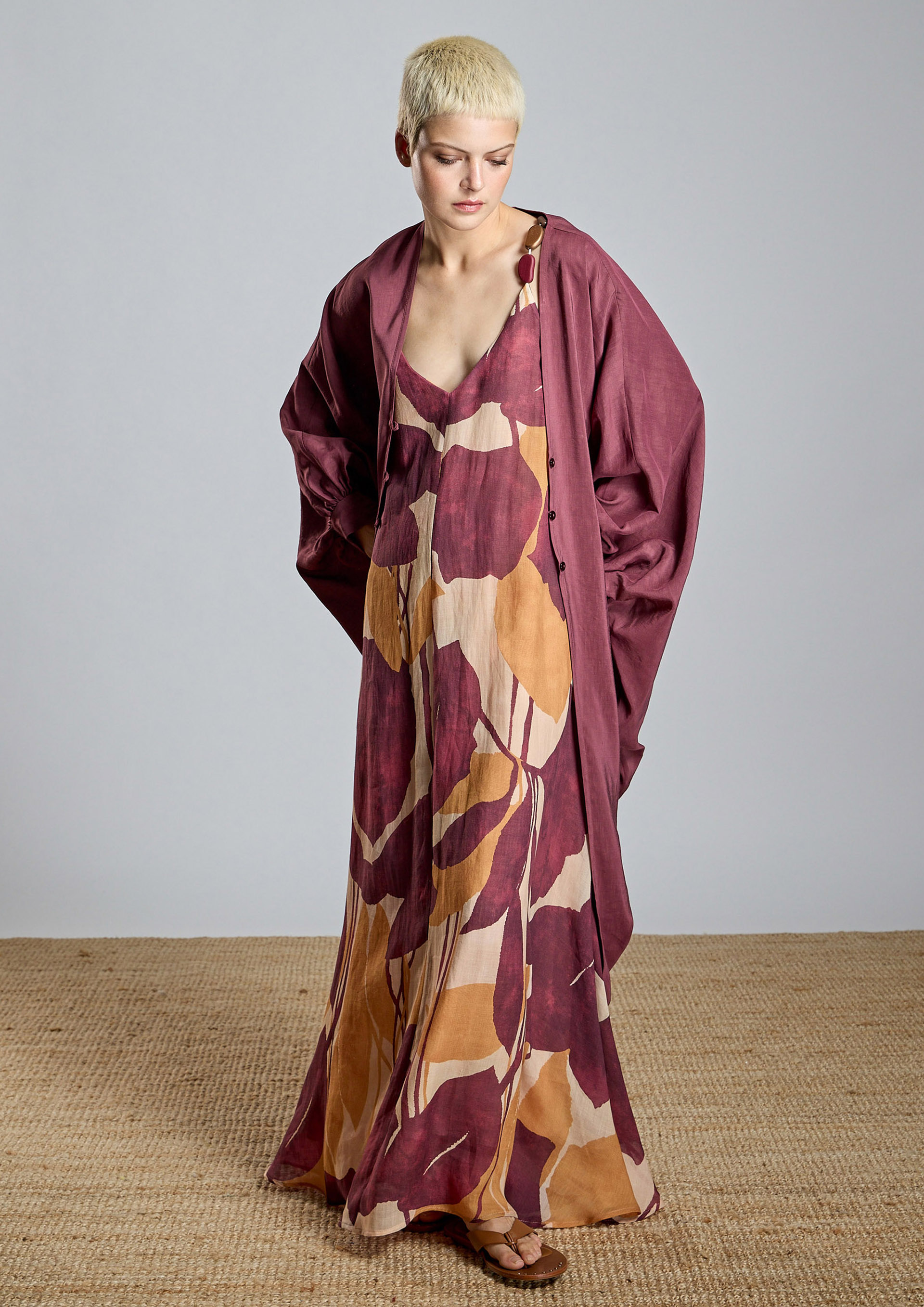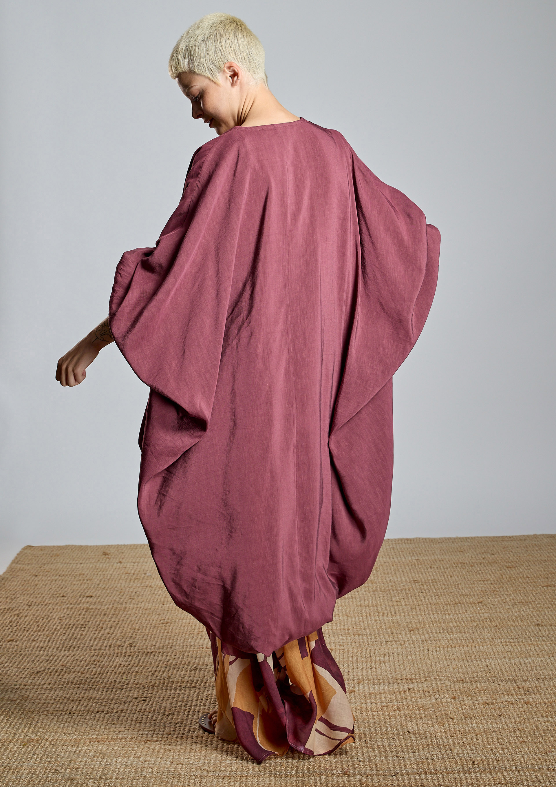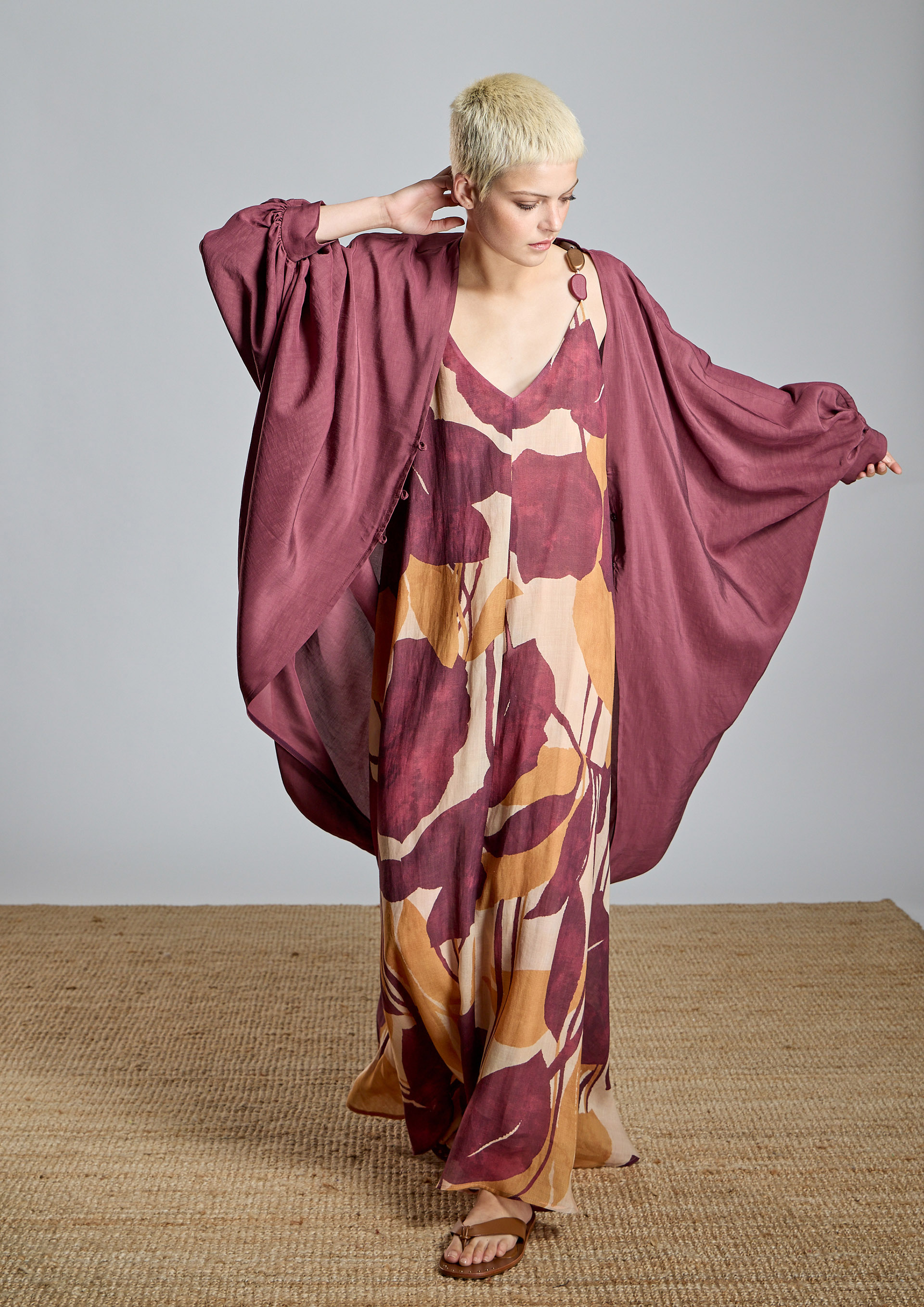 Kimono largo AC en viscosa con diseño abierto sin cierre. Presenta manga amplia tipo murciélago acabando con elástico en puños, caída ligera y bajo recto. Cierre central delantero con pequeña botonadura de nácar. Prenda versátil, ideal para completar looks estivales y de diario.