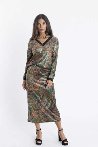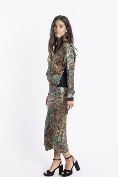 Falda midi con cintura elástica y una sutil abertura trasera que aporta movimiento y elegancia. Confeccionada en un tejido ligero de estampado cachemir adornado con lentejuelas transparentes, combina comodidad y un brillo discreto ideal para elevar cualquier look.