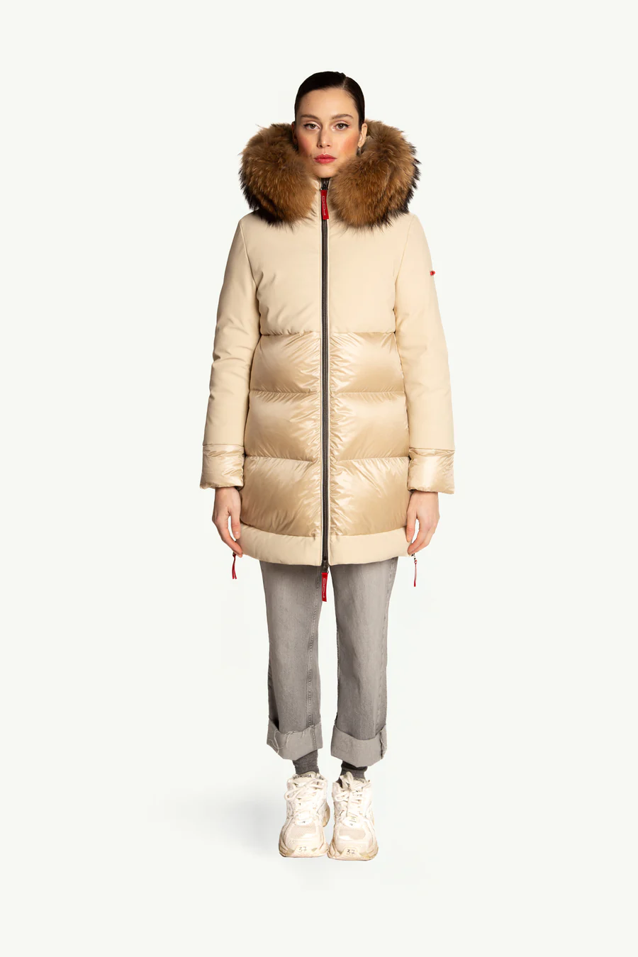 LOREA es una plumas que fusiona sofisticación y funcionalidad, combinando un tejido mate con detalles brillantes en el mismo tono para un acabado armonioso y moderno. Incluye una capucha con pelo natural que proporciona calidez y un toque de elegancia natural, perfecta para los días fríos sin renunciar al estilo.