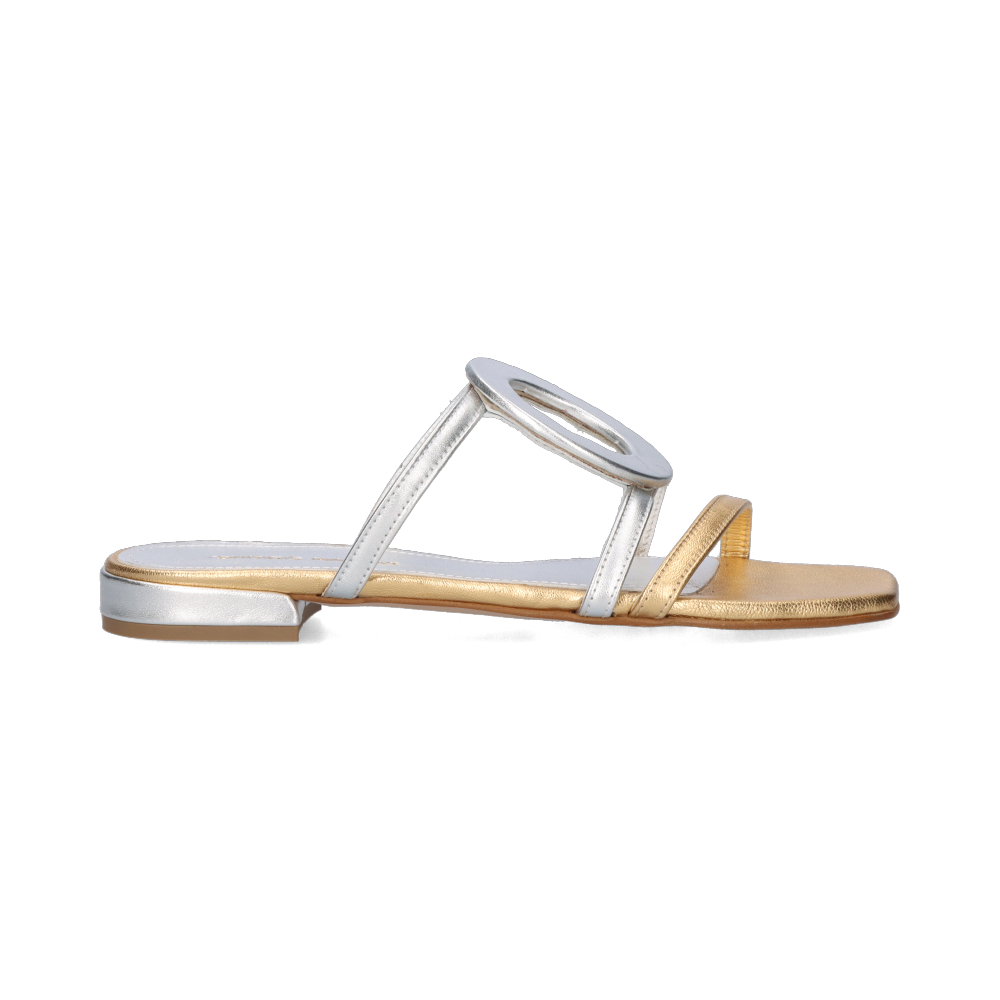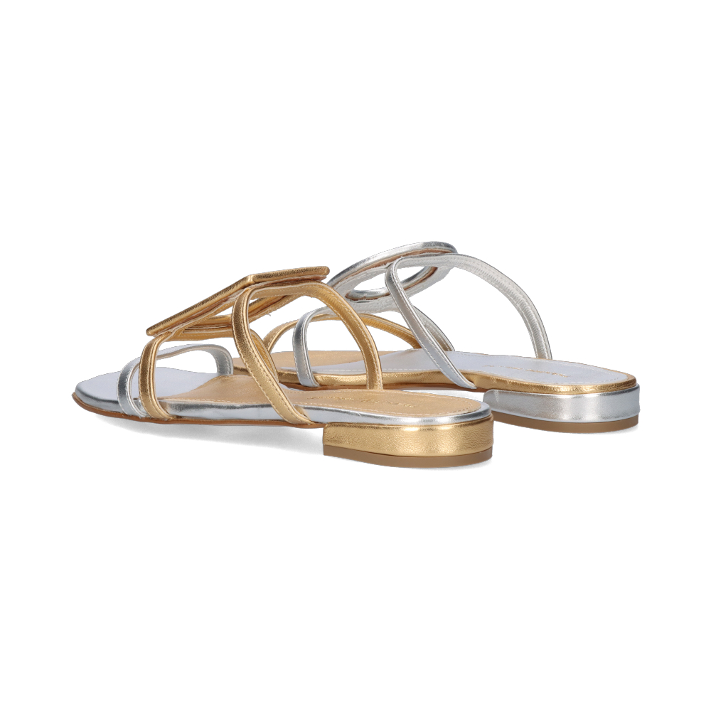 Doble brillo, máxima sofisticación. Estas sandalias de piel en tonos plata y dorado metalizado combinan dos metales icónicos en un diseño luminoso y contemporáneo.