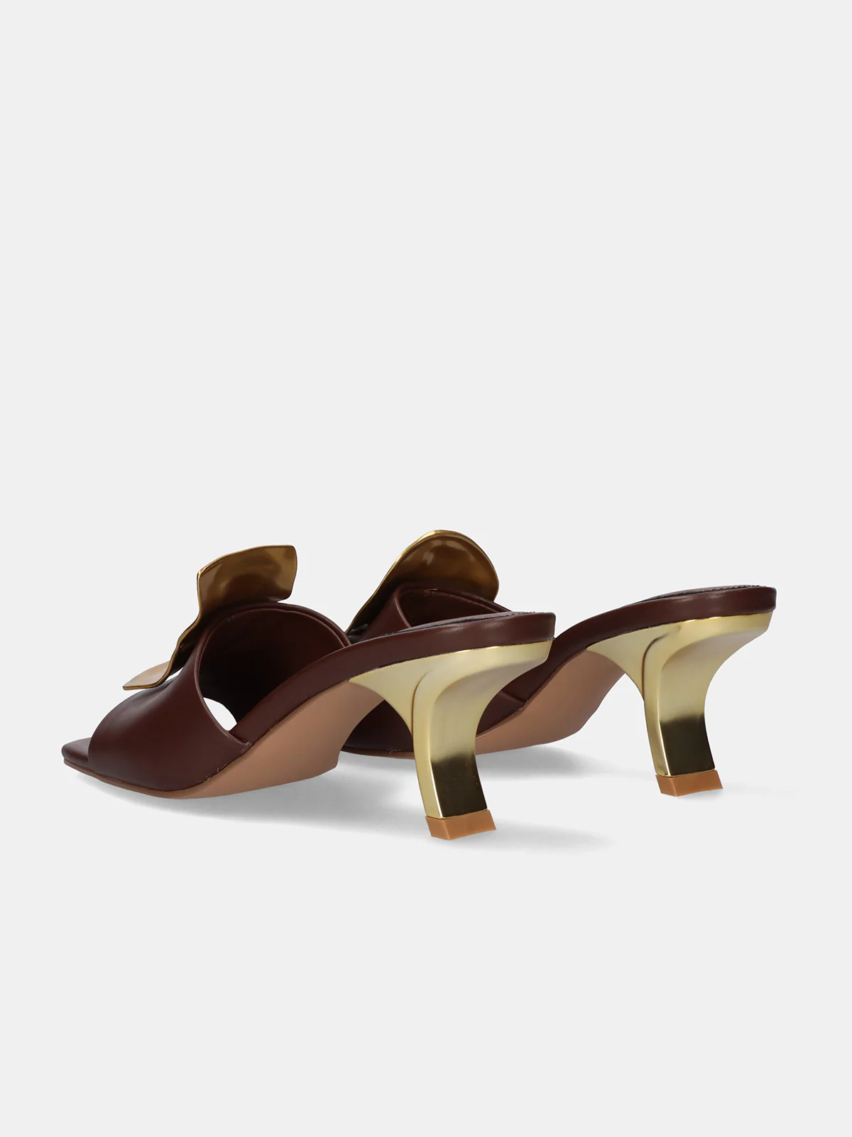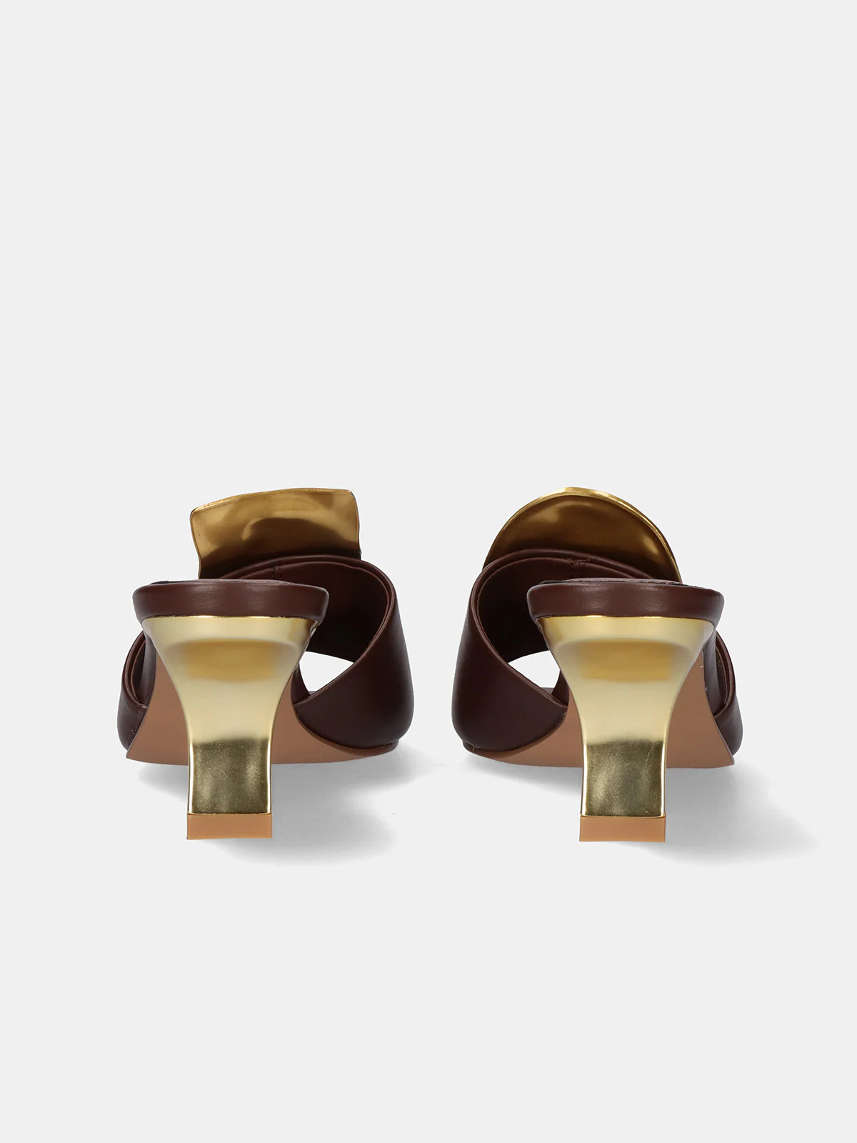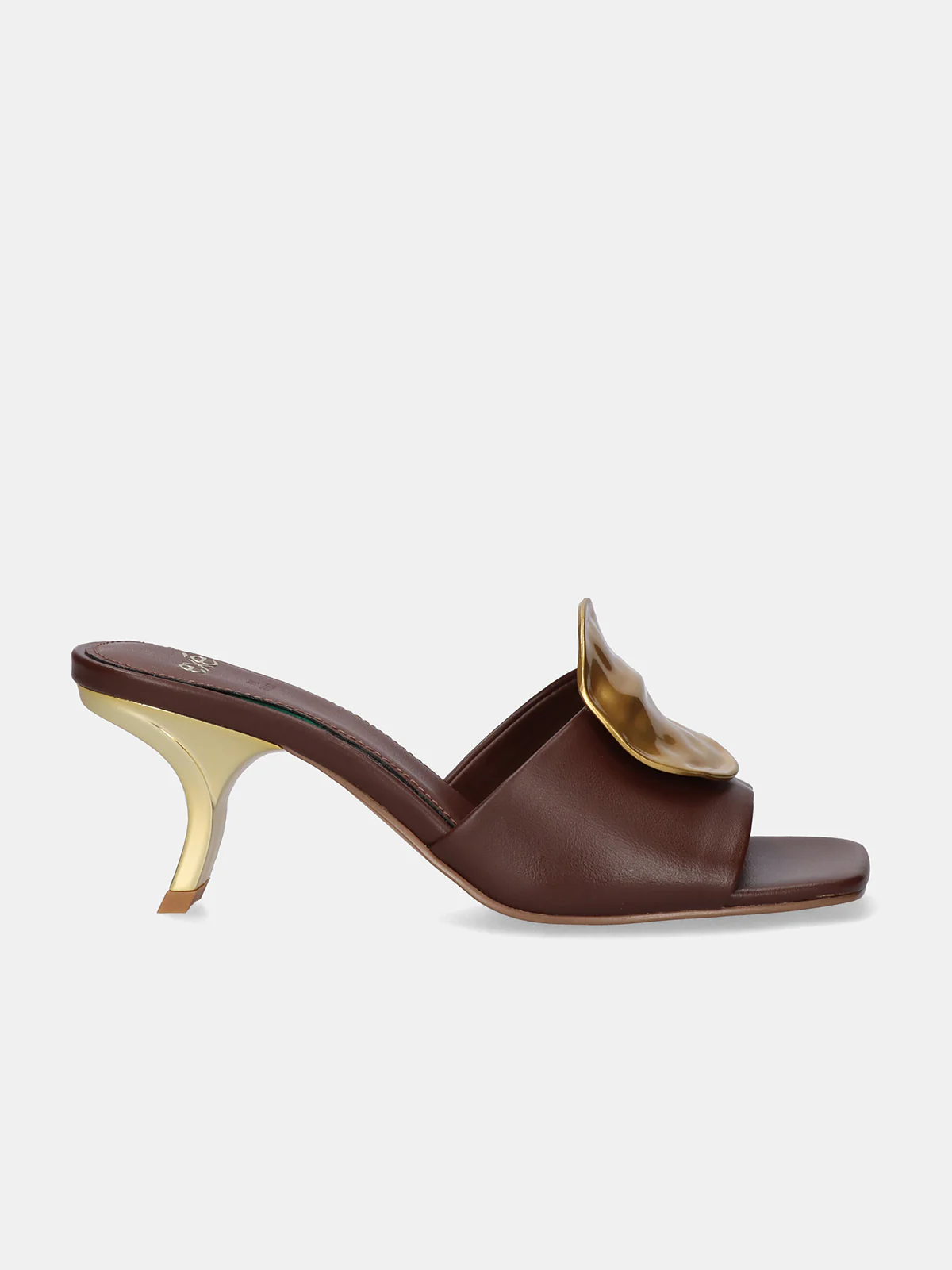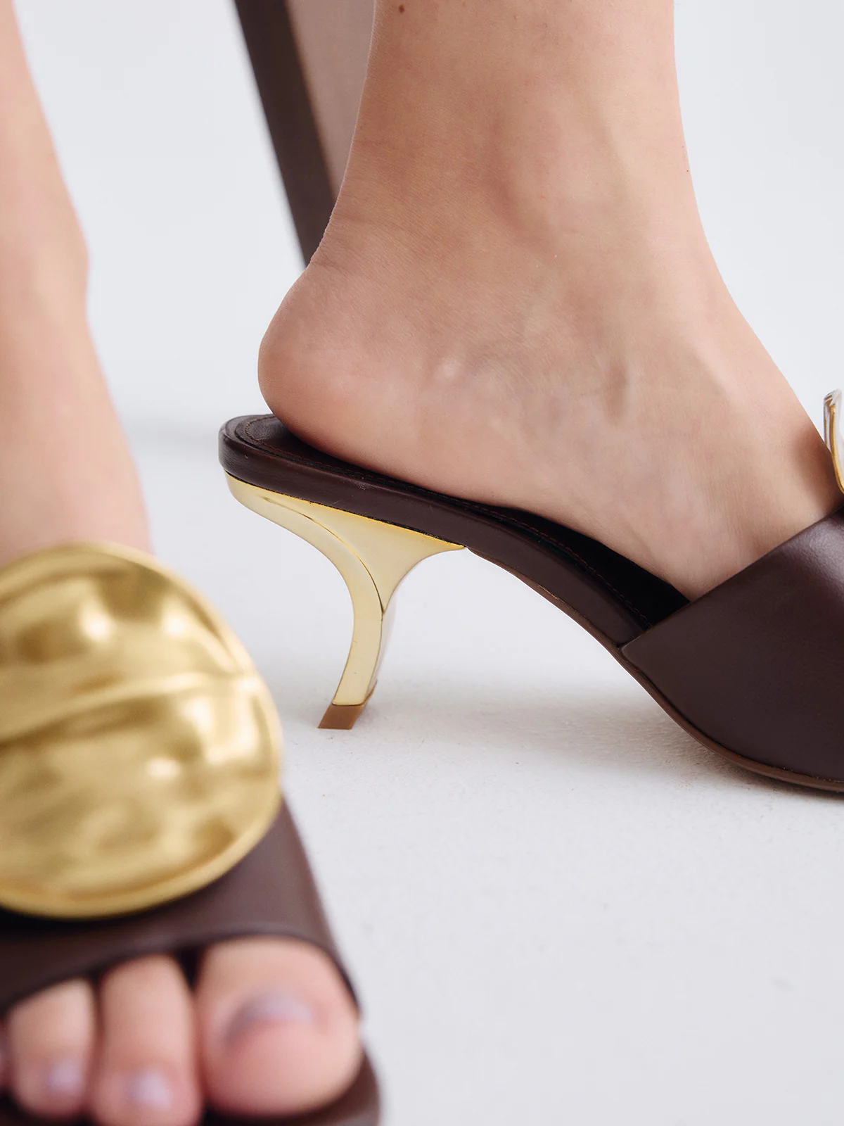 Sofisticación con carácter. Estas sandalias de tacón en color marrón con adorno metálico dorado reinterpretan el clásico con un toque contemporáneo y refinado. Perfectas para eventos, cenas especiales, looks de invitada o incluso para elevar un estilismo más minimalista de oficina.