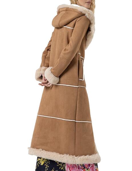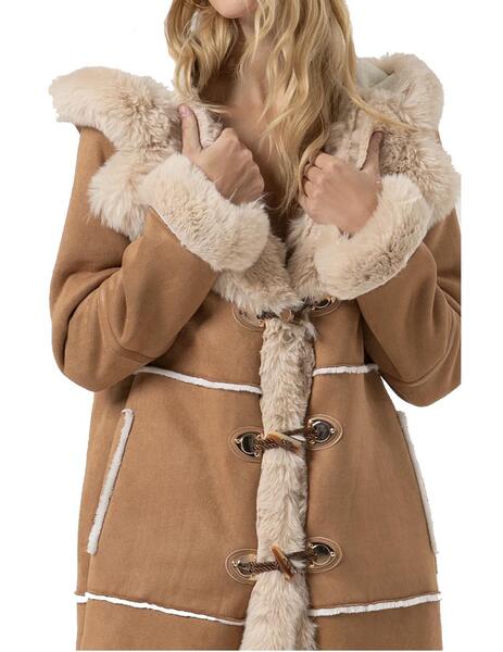 Abrigo largo con relleno de borreguillo. Capucha y detalles en ecopiel. Bolsillos en los lados y mangas largas.