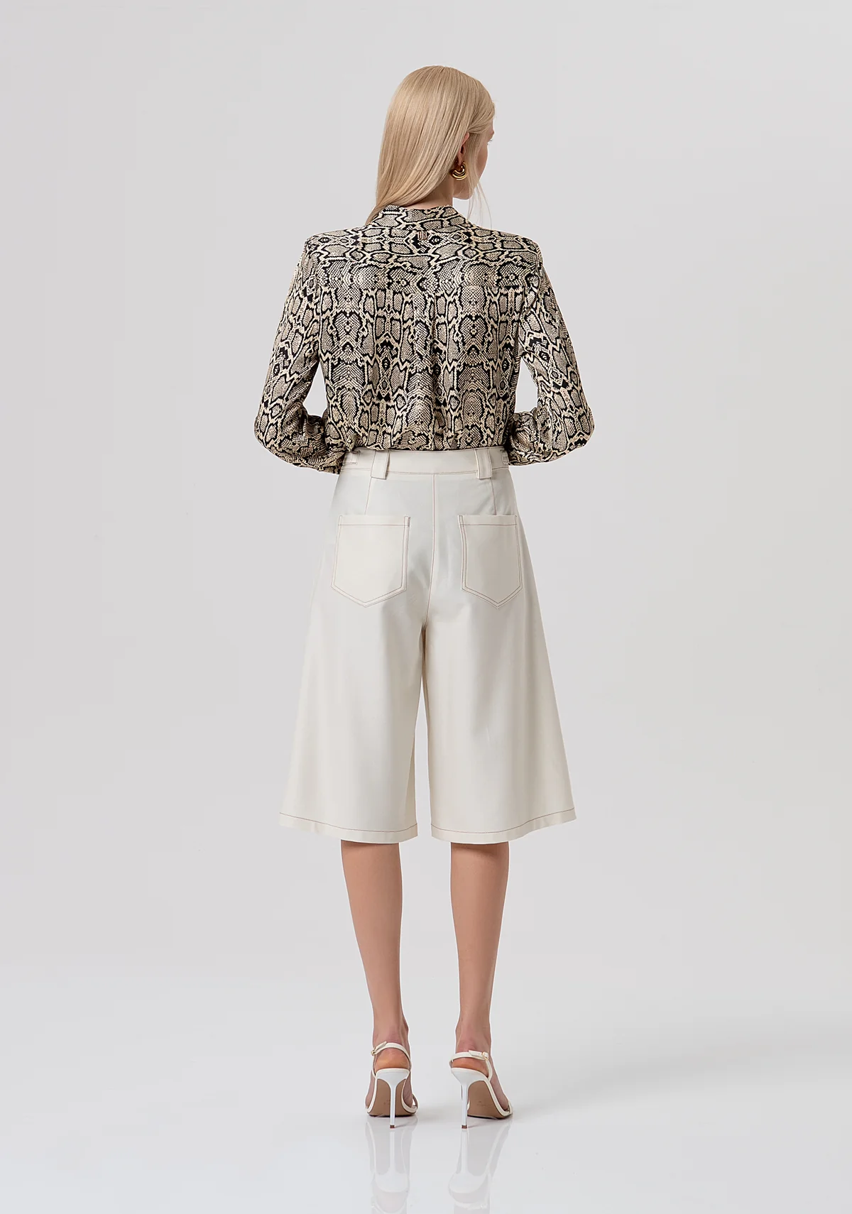 Bermudas acampanadas con pinzas. Cintura regular con hebillas laterales, bolsillos cuadrados delanteros, bolsillos de parche traseros y pernera ancha.