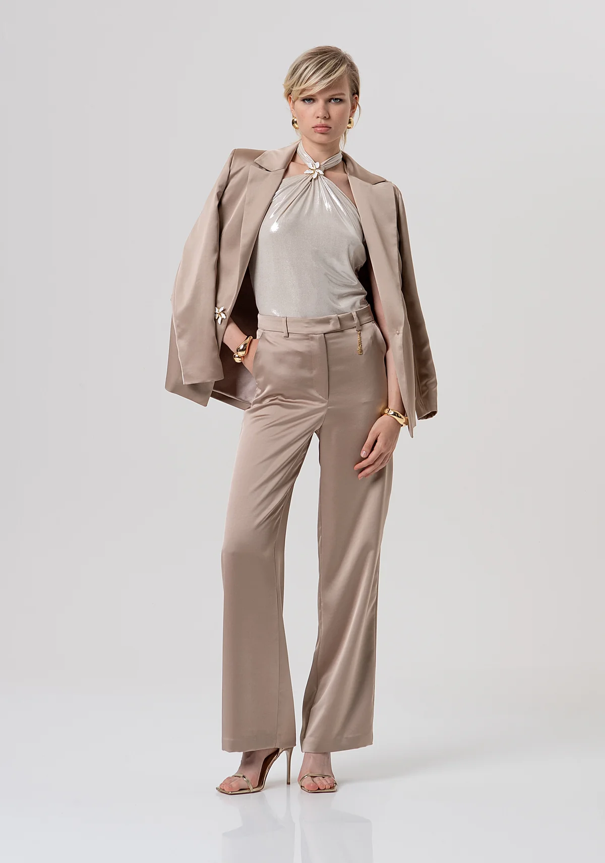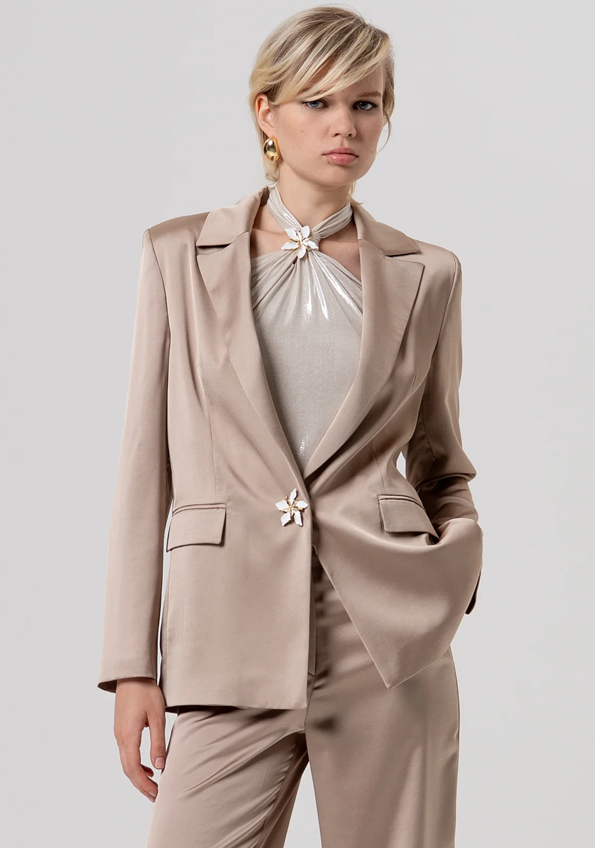 Blazer oversize de botonadura sencilla en satén. Corte clásico con solapas, botón joya para la apertura, solapas laterales y manga larga.
