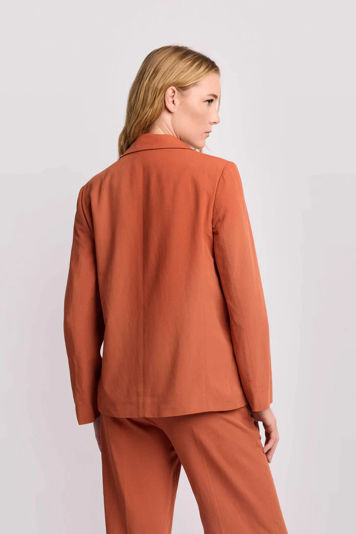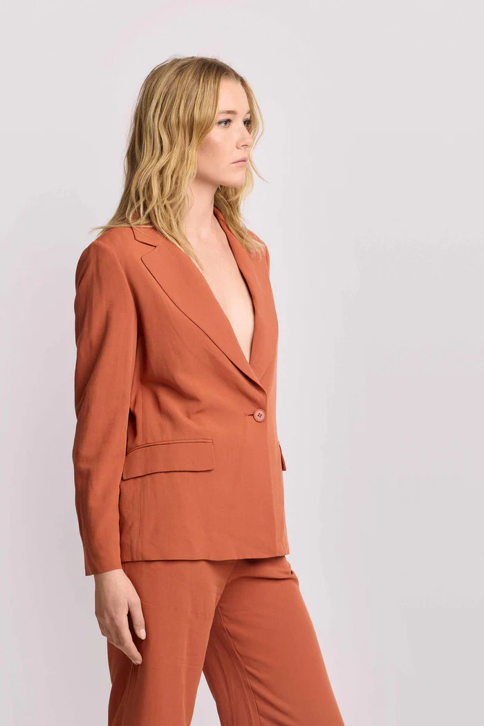 Americana de corte recto confeccionada en tejido ligero, ideal para un estilo profesional refinado y fresco. Presenta solapas clásicas, cierre frontal de un solo botón y funcionales bolsillos de solapa laterales. Su caída fluida en tono teja aporta elegancia sin sacrificar la comodidad diaria.