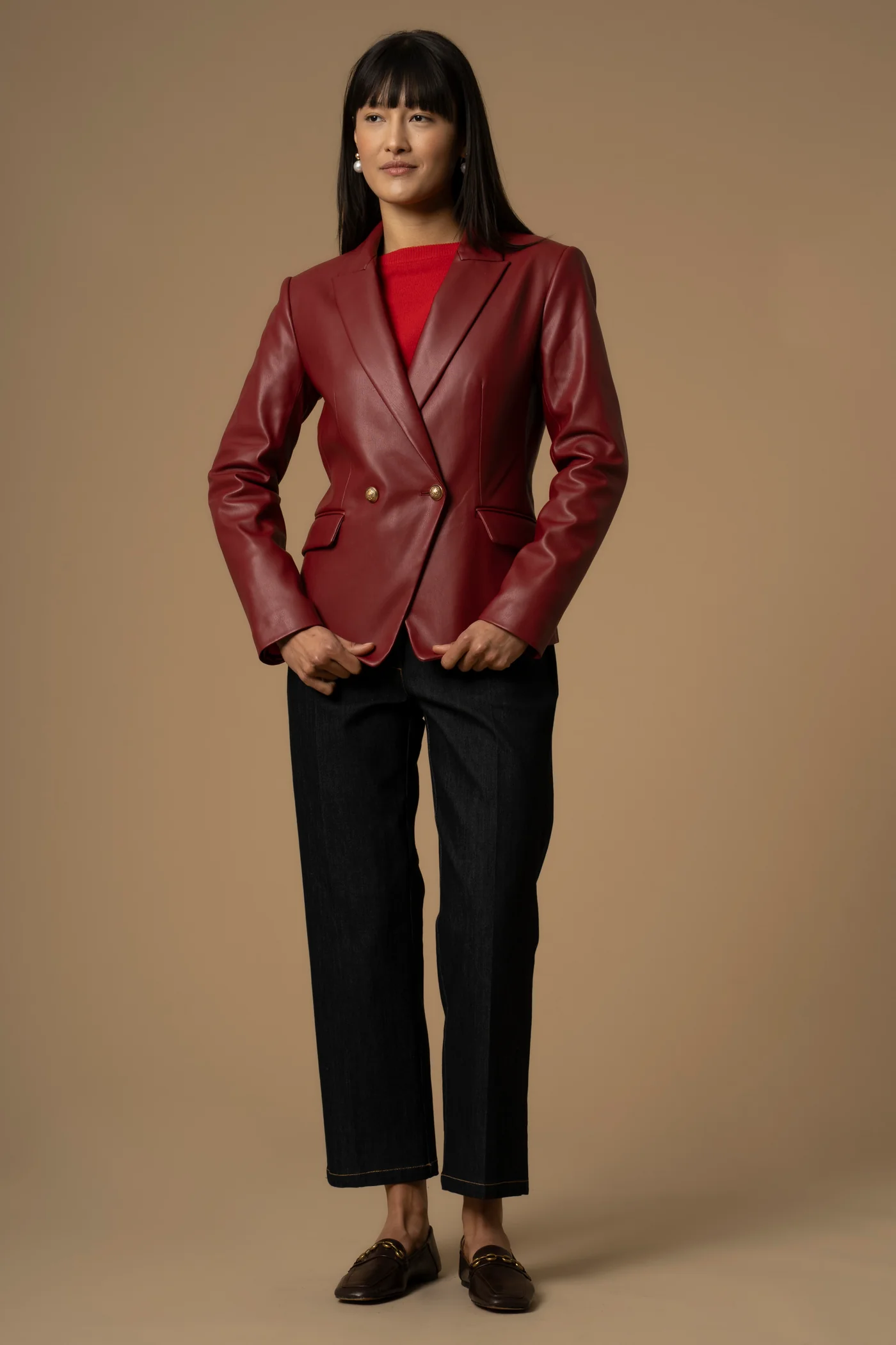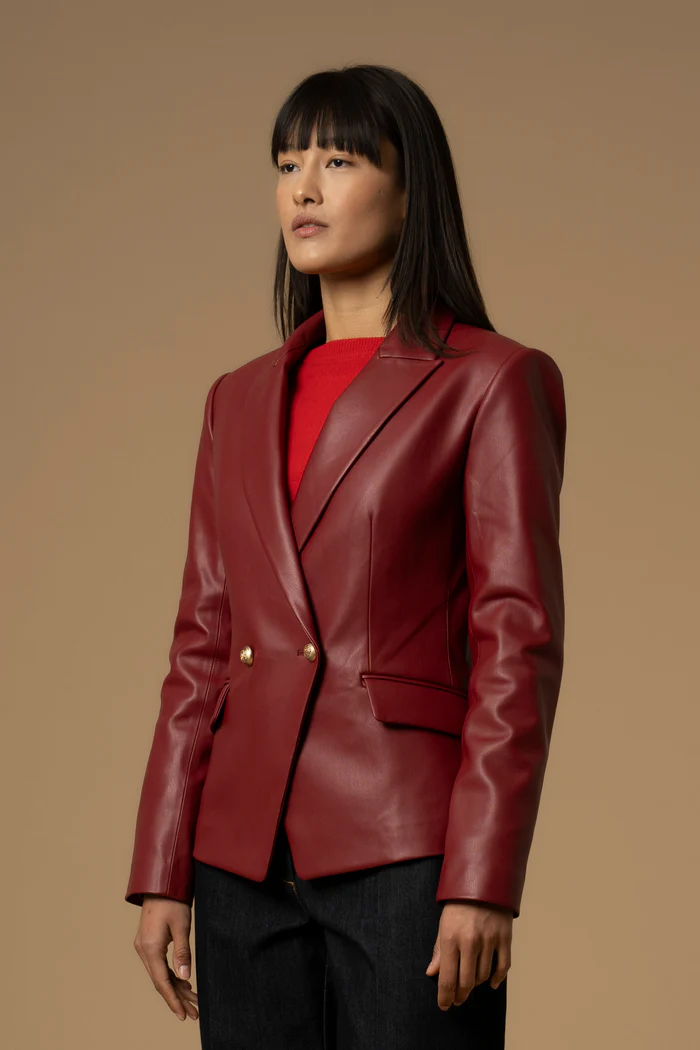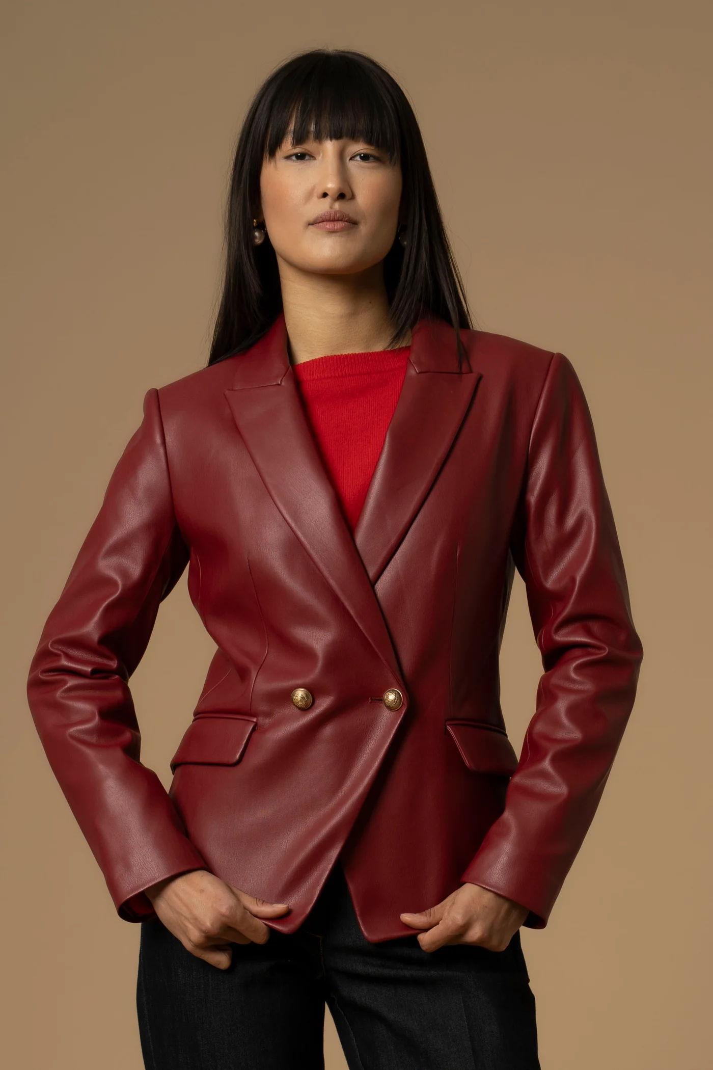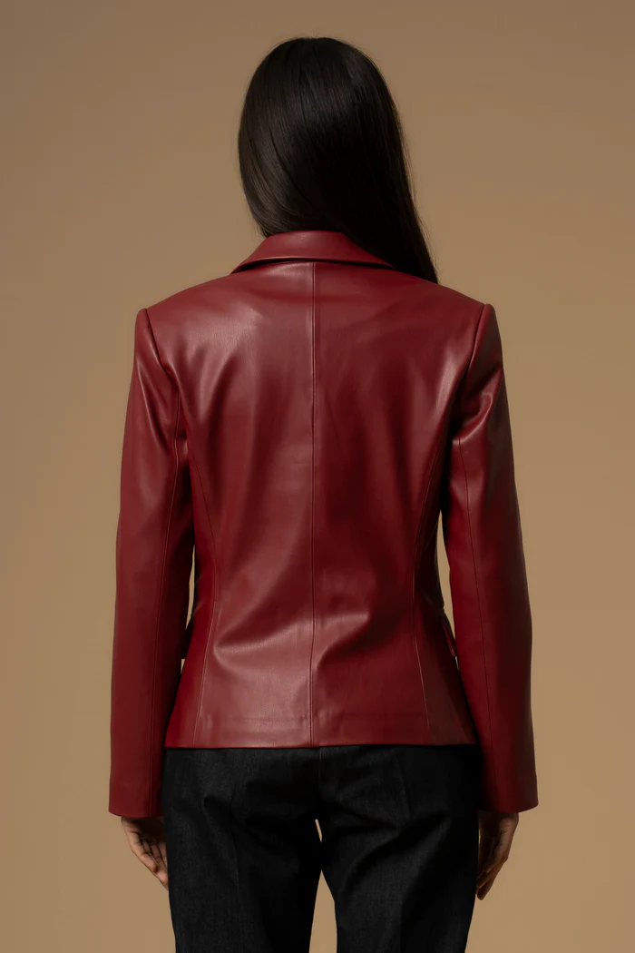 Blazer de piel sintética con solapa de muesca, manga larga, cierre de botones y dos bolsillos delanteros para un look elegante y contemporáneo.