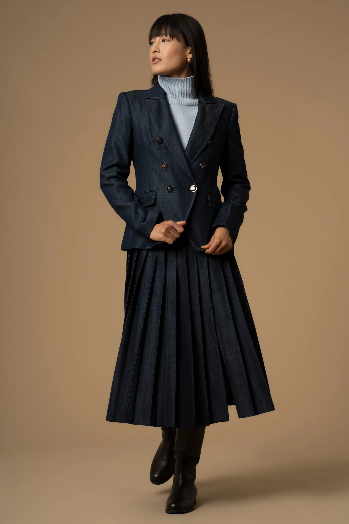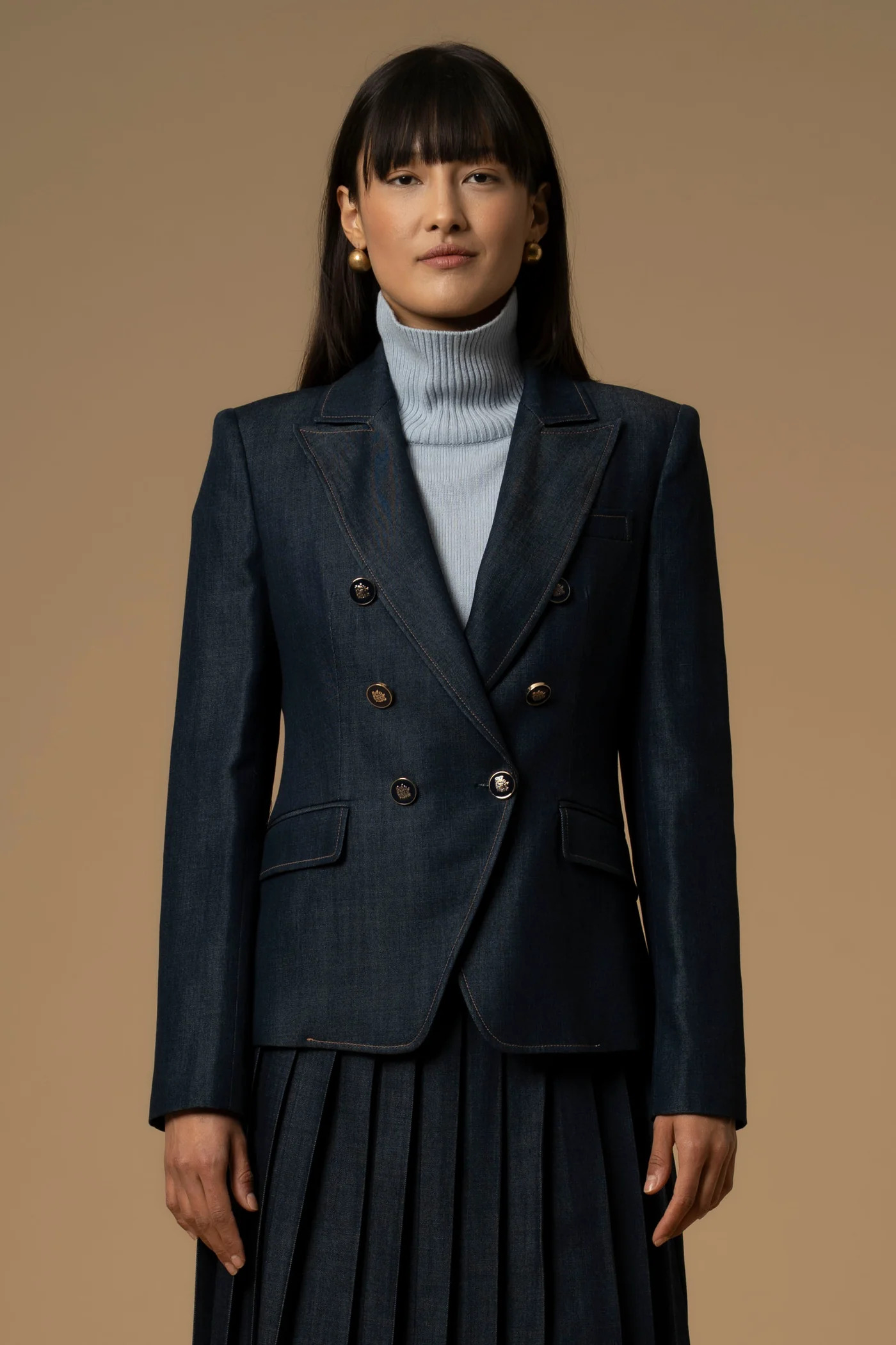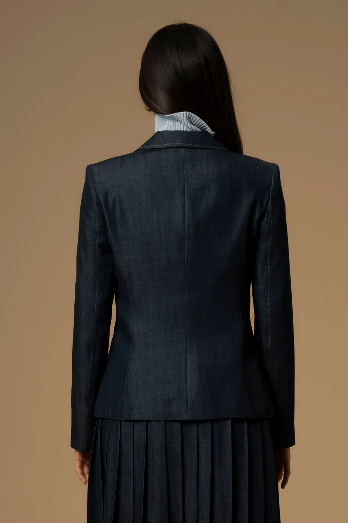 Blazer en denim con solapas sofisticadas, cierre cruzado y botones dorados que brillan con estilo. Manga larga y bolsillos laterales para un look urbano y chic.