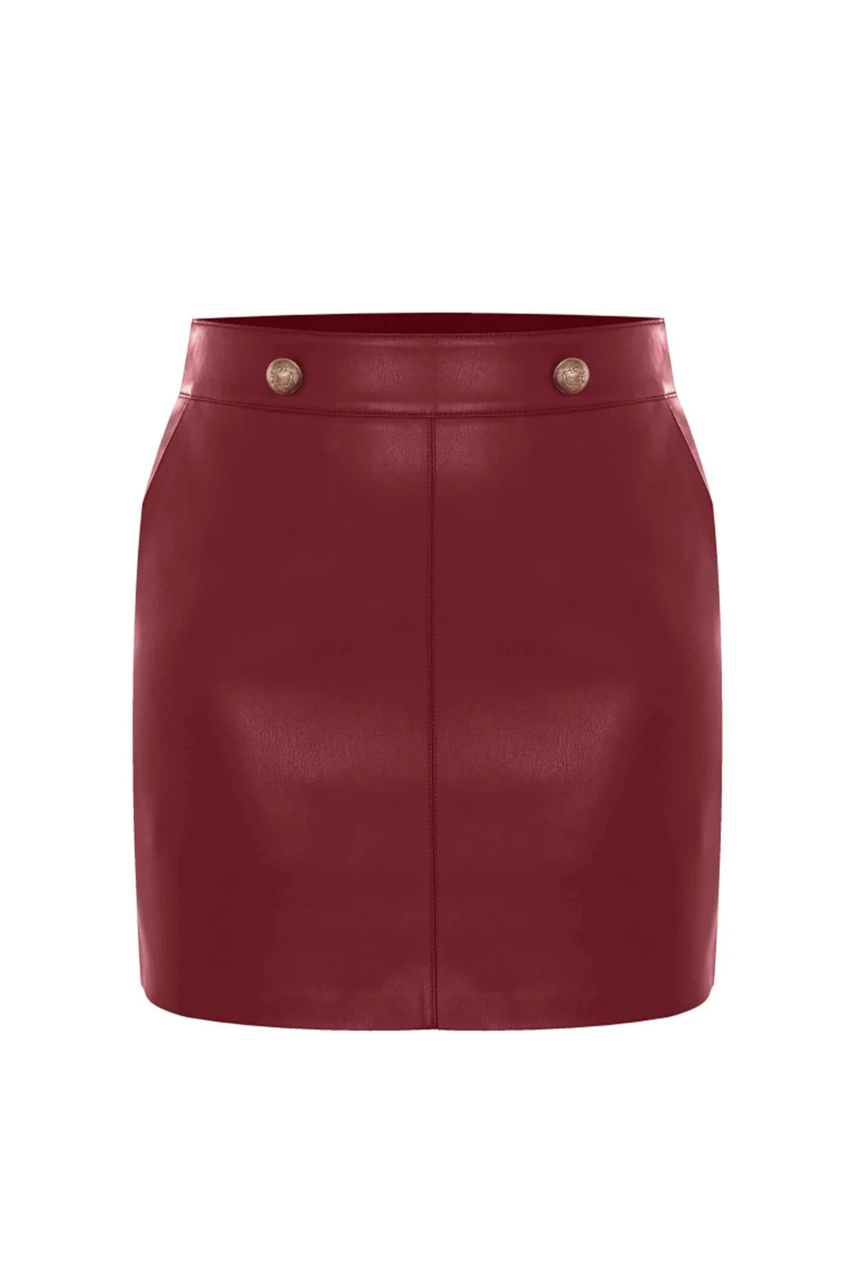 Falda corta de tiro alto con dos botones frontales que imponen personalidad y una cintura marcada que realza un look audaz y sofisticado.