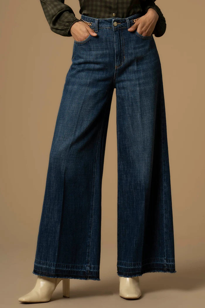 Jeans de tiro alto con pierna ancha y bajo deshilachado. Cierre clásico y bolsillos funcionales para un look desenfadado y con estilo.