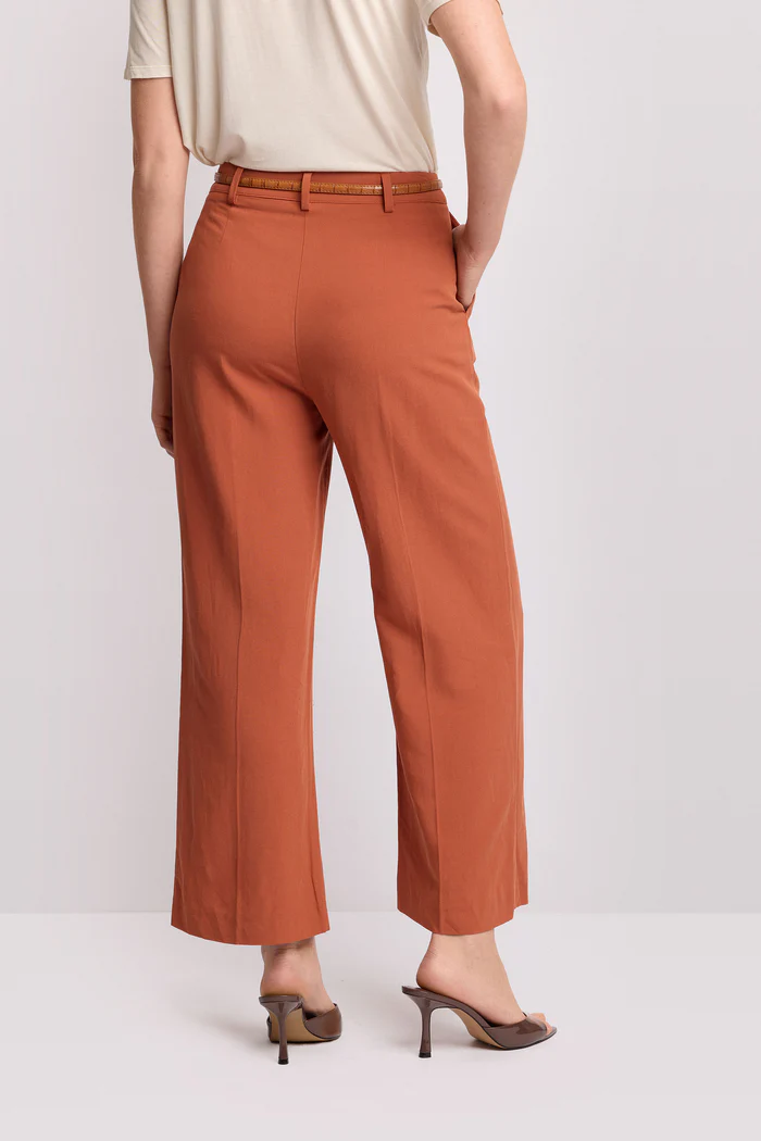 Pantalón de tiro medio y pernera ancha, ideal para oficina. Diseño con trabillas y prácticos bolsillos laterales. Cierre frontal con botón y cremallera.