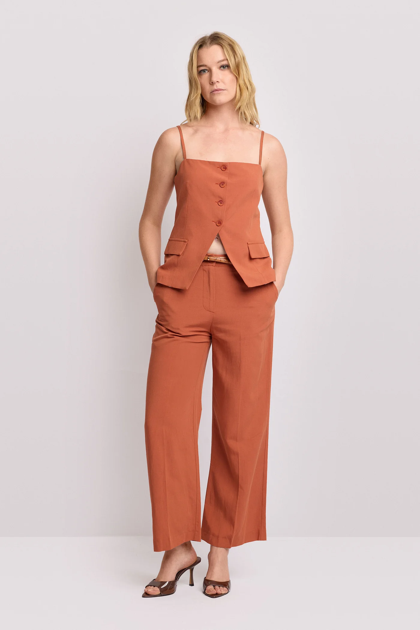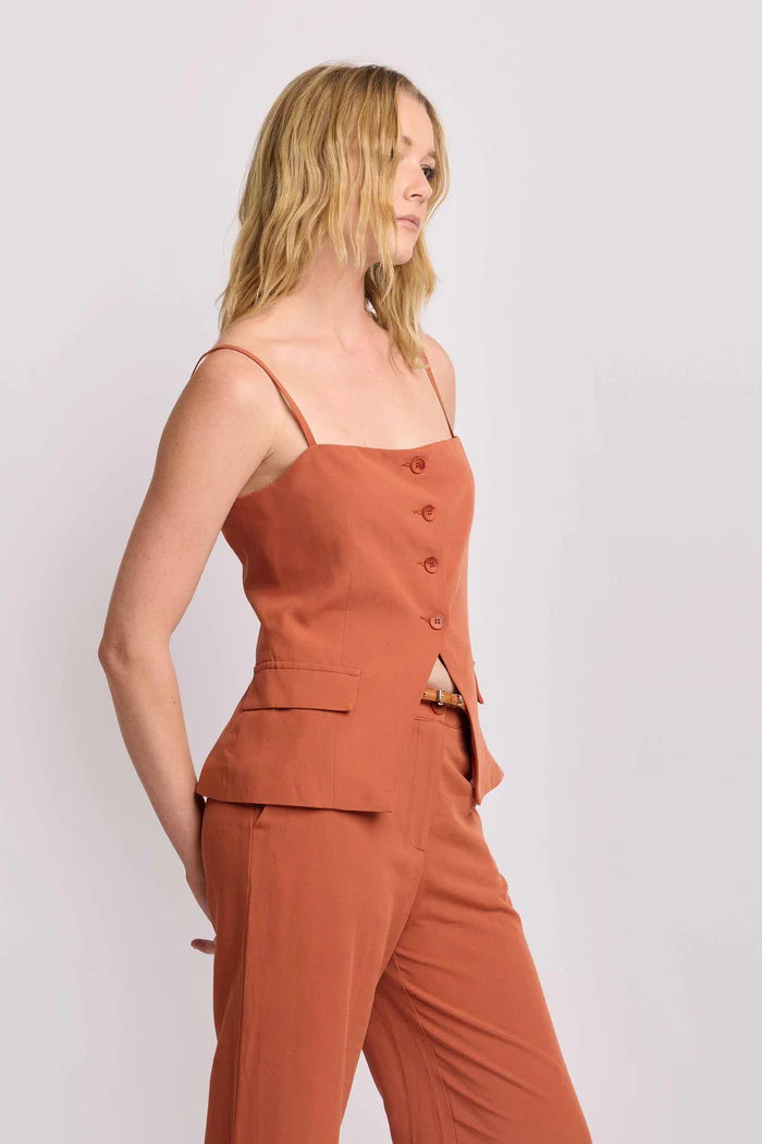 Top de estilo chaleco con tirantes. Cierre frontal de botones y bolsillos. Bajo asimétrico y espalda con abertura. Ideal para un conjunto de oficina.