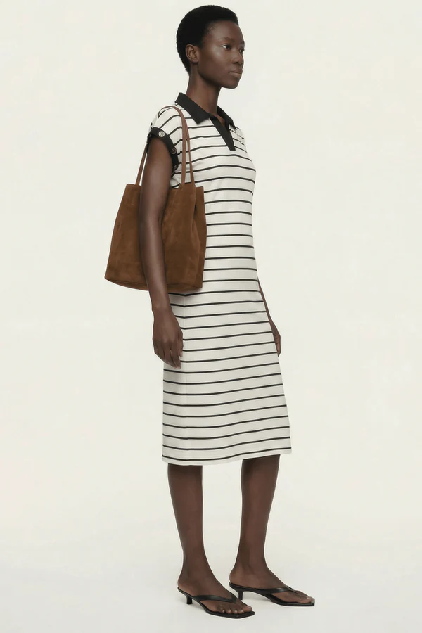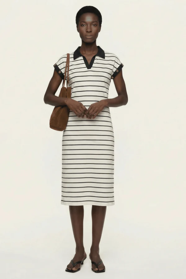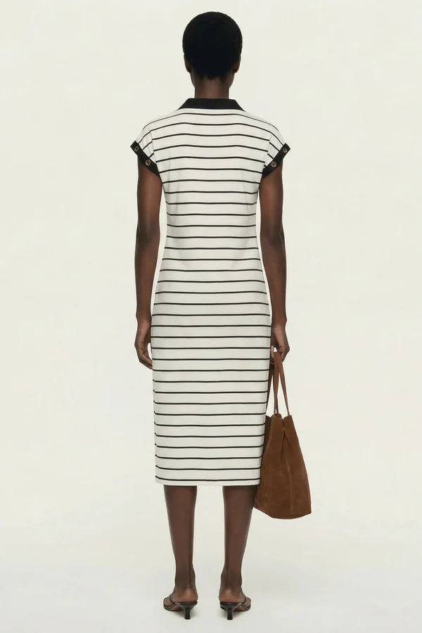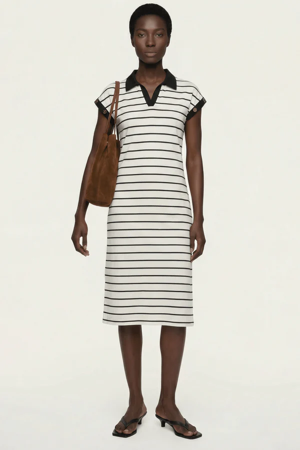 Un vestido de rayas marineras que tiene mucho más que contar. El cuello tipo polo en negro con abertura frontal y botones te deja elegir entre un look más abierto y relajado o más cerrado y arreglado, según el día. Los ojales dorados en las mangas cortas repiten ese guiño sofisticado que ya conoces, y el algodón con elastano garantiza que vayas cómoda aunque el día se alargue. Largo mini, fabricado en Portugal. Para las que quieren un vestido de verano que funcione de verdad.