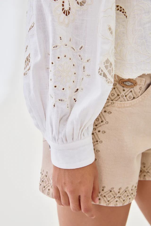 Blusa con lino de manga larga con cuello redondo. Mangas abullonadas con puños de camiseros con botón. Detalle de motivos florales bordados y calados. Bajo acabado en forma de ondas. Abertura en la parte superior de la espalda con cierre de botón.