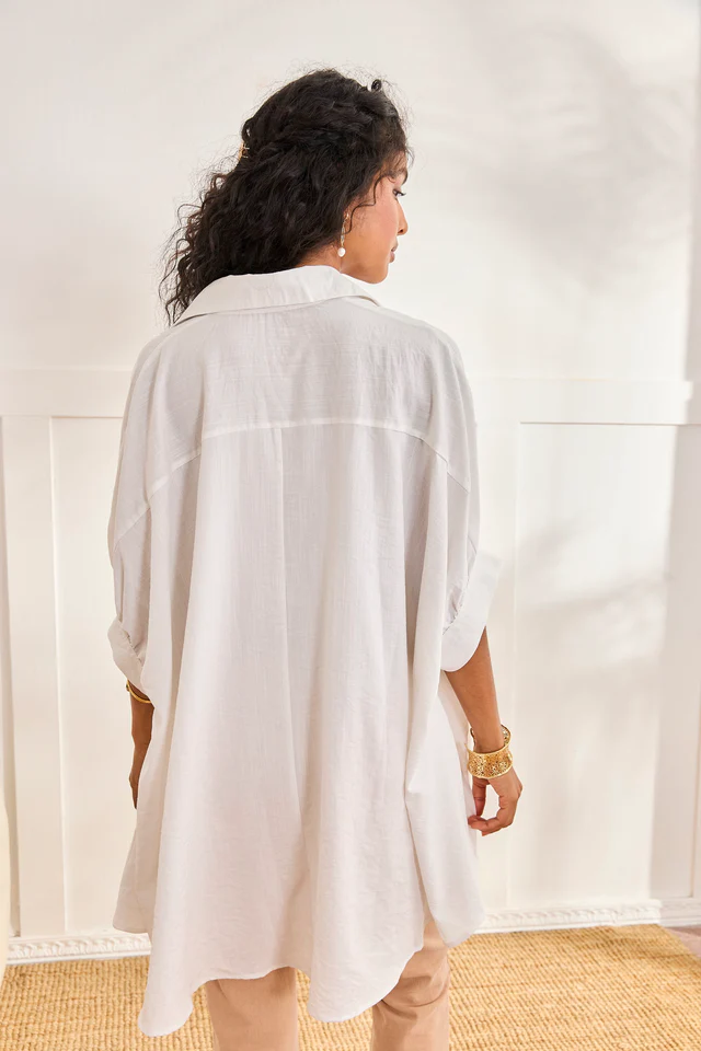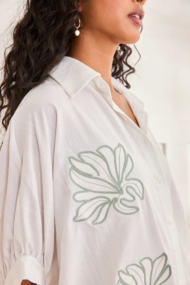 Blusón camisero con botonadura frontal completa. Detalle de bordado floral. Mangas caídas 3/4 con puño.