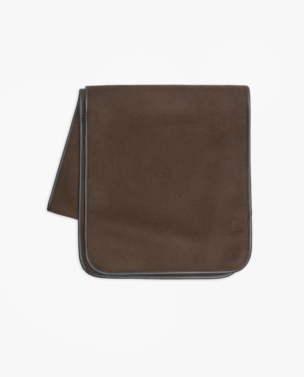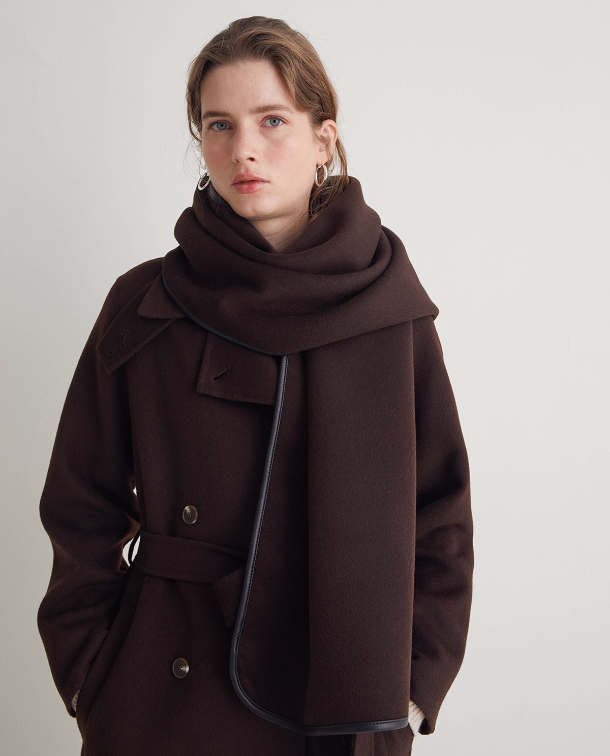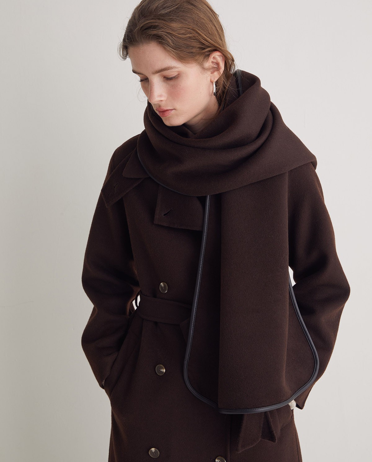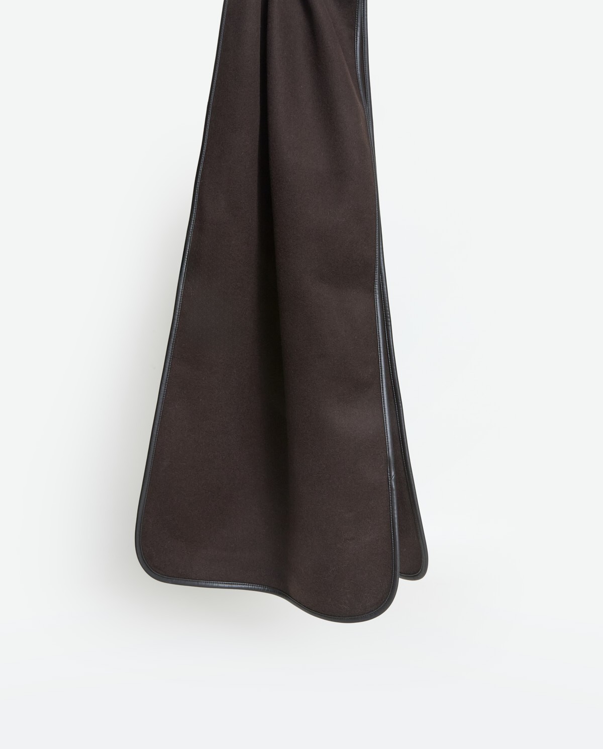 Bufanda doble faz. Tejido mezcla con lana. Ribete en piel vegana. Acabados en forma redonda. Medidas: 180×42 cm.