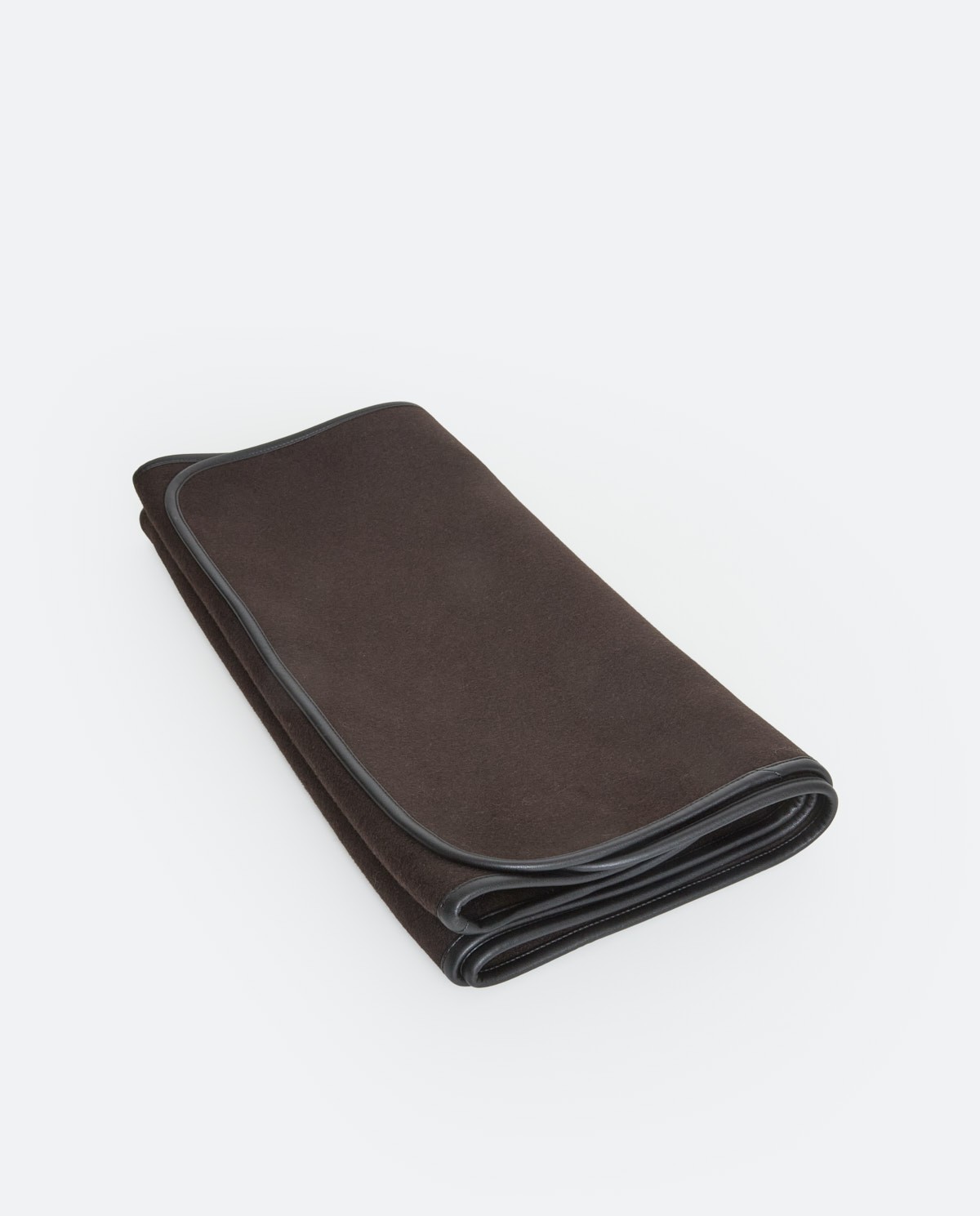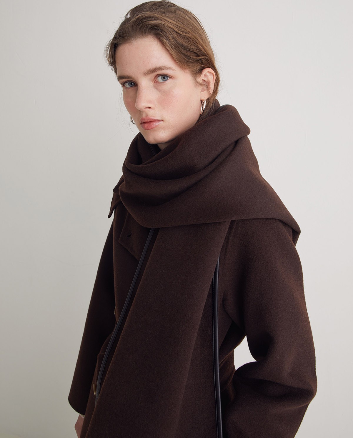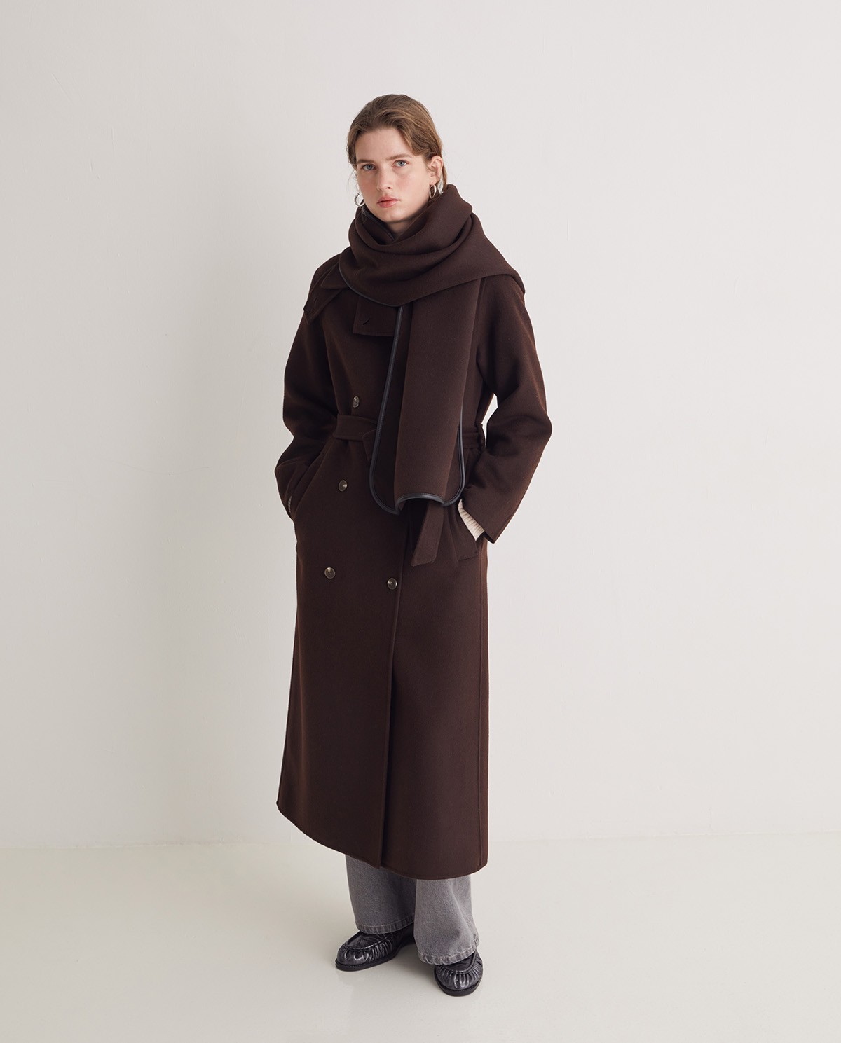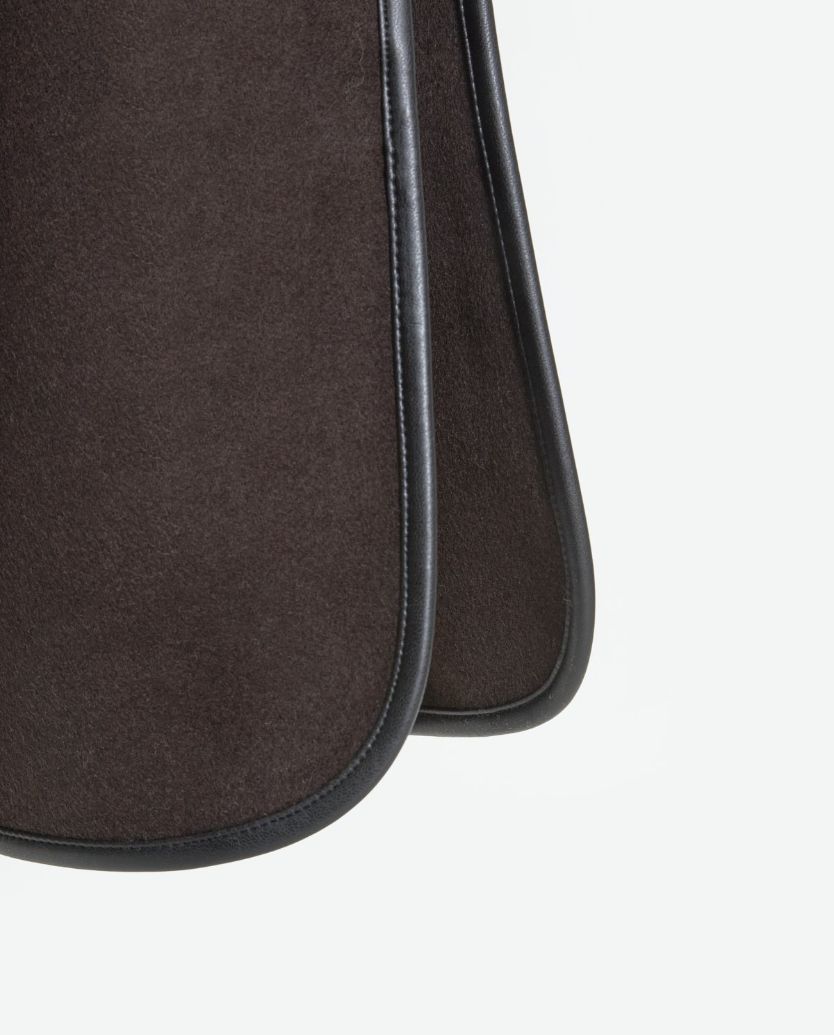 Bufanda doble faz. Tejido mezcla con lana. Ribete en piel vegana. Acabados en forma redonda. Medidas: 180×42 cm.